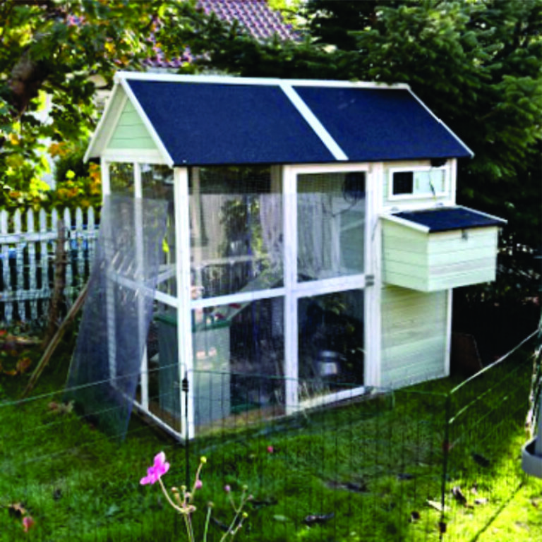 Stabilt hønsehus med FSC-sertifisert tre og rustfri konstruksjon.