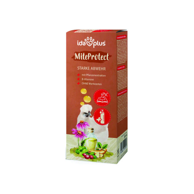 IdaPlus MiteProtect er et naturlig tilskudd utviklet for å støtte høner og annet fjørfe etter belastninger som for eksempel angrep av hønsemidd eller andre ektoparasitter. Produktet inneholder planteekstrakter og B-vitaminer som bidrar til økt appetitt, bedre vitalitet og styrket allmenntilstand.