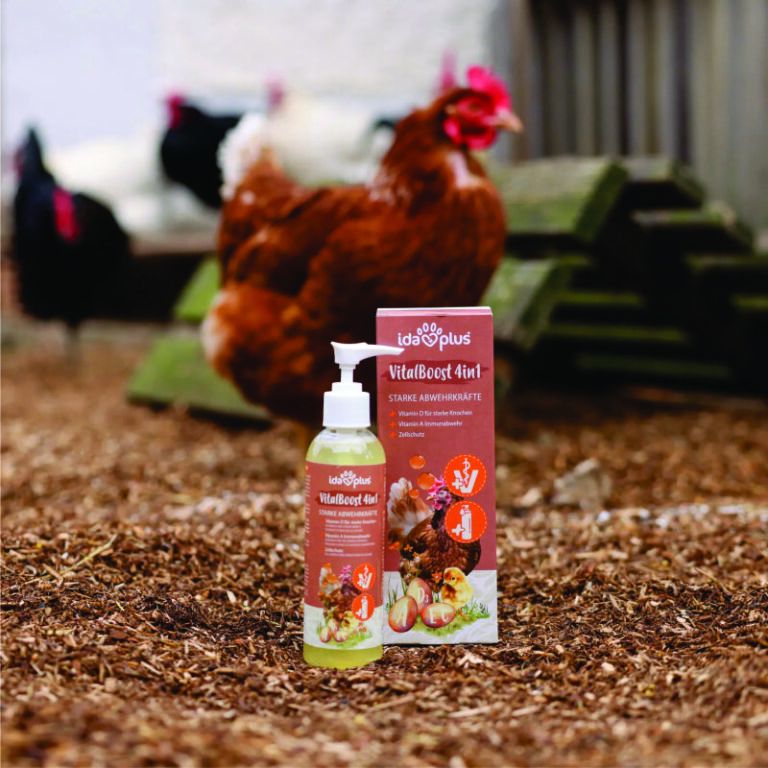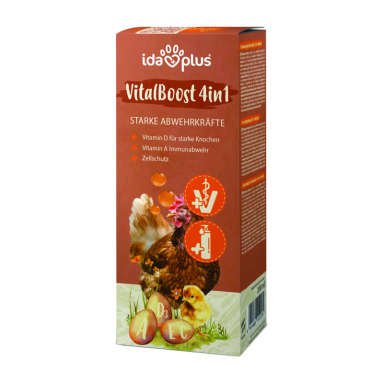 IdaPlus VitalBoost 4in1 er et effektivt vitamintilskudd som gir høner og annet fjørfe en optimal tilførsel av vitamin A, D3, E og C. Disse vitaminene bidrar til sunn vekst, sterkere immunforsvar, god metabolisme og bedre fertilitet.