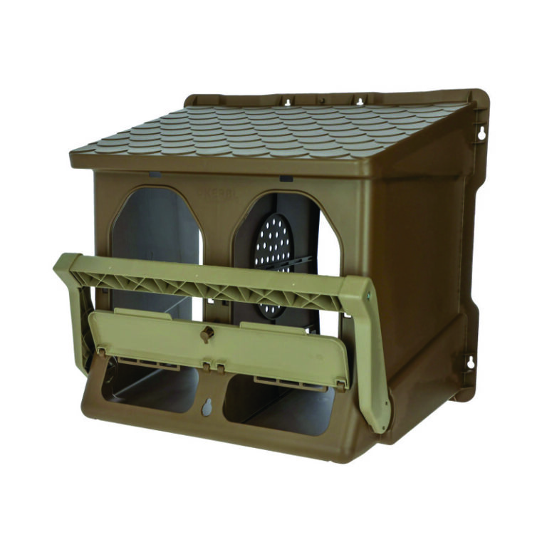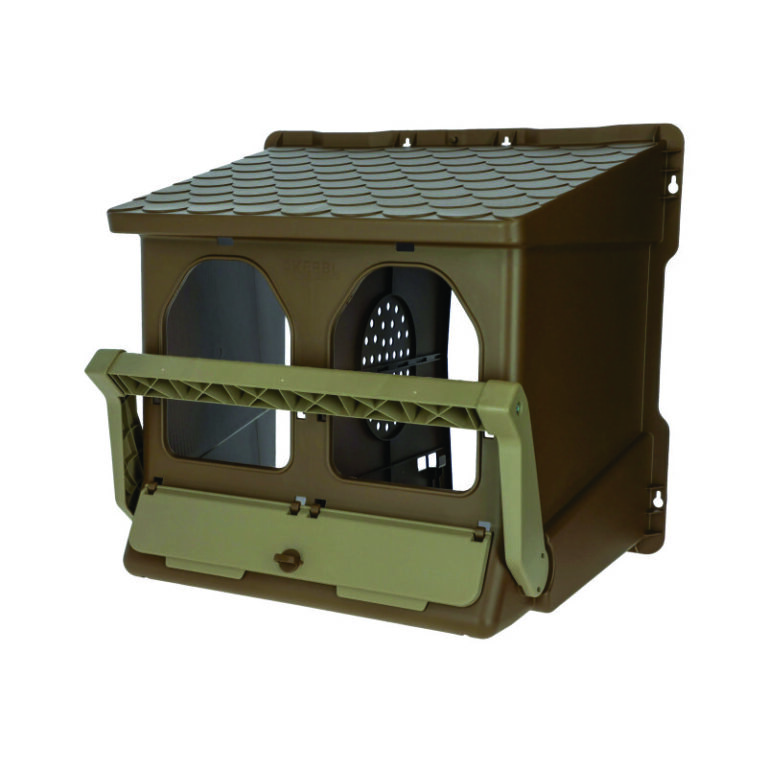 Den integrerte sittepinnen gjør det enklere for hønene å komme inn i redet. Når pinnen foldes opp kan redet også stenges, for eksempel om natten eller når det ikke skal brukes.